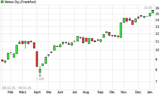 Mit dem Anstieg auf 15,48 EUR hat die Metso Outotec-Aktie (ISIN FI0009014575) am 07.01.2026 ein neues All-Time-High erreicht und damit den Kurs vom 06.01.2026 eingestellt.