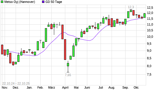 Mit dem Anstieg auf 11,90 EUR hat die Metso Outotec-Aktie am 21.10.2025 die 50-Tage-Linie nach oben gekreuzt.