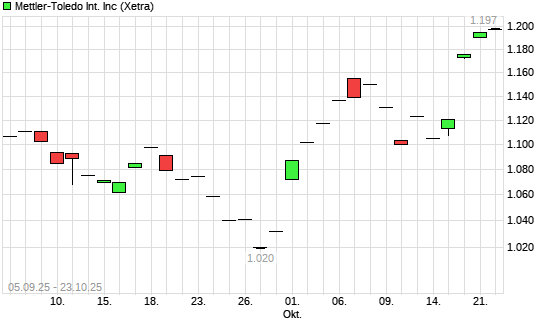 Mit dem Anstieg auf 1.189,50 EUR hat die Mettler-Toledo-Aktie (ISIN US5926881054) am 22.10.2025 ein neues 6-Monats-Hoch erreicht und damit den Kurs vom 21.10.2025 eingestellt.