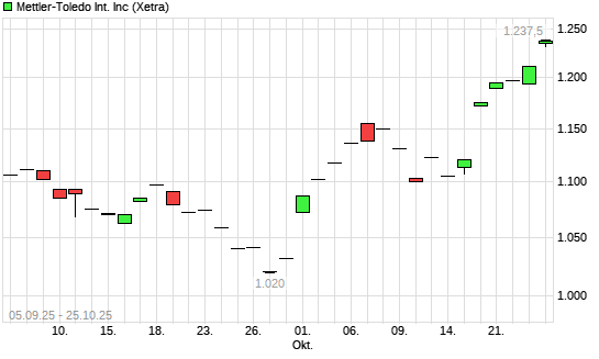 Mit dem Anstieg auf 1.249,50 EUR hat die Mettler-Toledo-Aktie (ISIN US5926881054) am 24.10.2025 ein neues 6-Monats-Hoch erreicht und damit den Kurs vom 22.10.2025 eingestellt.