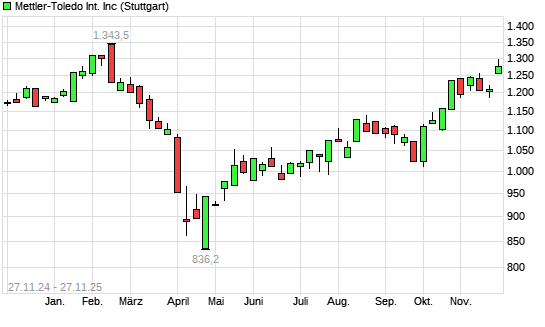 Mit dem Anstieg auf 1.296,00 EUR hat die Mettler-Toledo-Aktie (ISIN US5926881054) am 26.11.2025 ein neues 6-Monats-Hoch erreicht und damit den Kurs vom 25.11.2025 eingestellt.