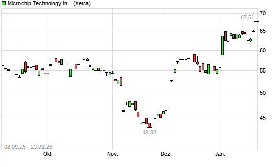 Mit dem Anstieg auf 65,38 EUR hat die Microchip Technology-Aktie (ISIN US5950171042) am 22.01.2026 ein neues 6-Monats-Hoch erreicht und damit den Kurs vom 15.01.2026 eingestellt.