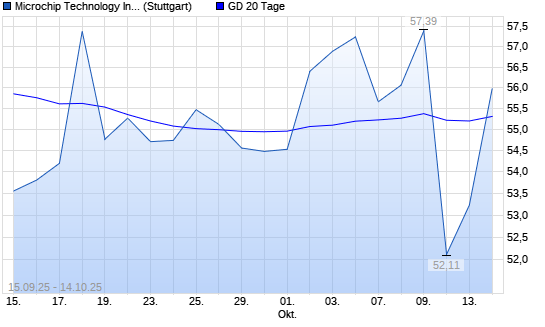 Mit dem Anstieg auf 55,76 EUR hat die Microchip Technology-Aktie am 13.10.2025 die 20-Tage-Linie nach oben gekreuzt.