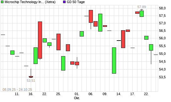 Mit dem Rücksetzer auf 54,06 EUR hat die Microchip Technology-Aktie am 23.10.2025 die 50-Tage-Linie nach unten gekreuzt.
