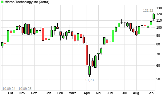 Mit dem Anstieg auf 115,38 EUR hat die Micron Technology-Aktie (ISIN US5951121038) am 09.09.2025 ein neues 12-Monats-Hoch erreicht und damit den Kurs vom 08.09.2025 eingestellt.
