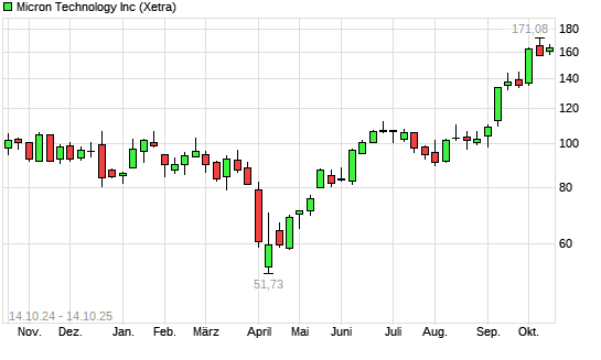 Mit dem Anstieg auf 166,64 EUR hat die Micron Technology-Aktie (ISIN US5951121038) am 13.10.2025 ein neues All-Time-High erreicht und damit den Kurs vom 08.10.2025 eingestellt.