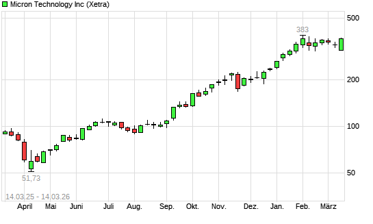 Mit dem Anstieg auf 371,50 EUR hat die Micron Technology-Aktie (ISIN US5951121038) am 13.03.2026 ein neues All-Time-High erreicht und damit den Kurs vom 02.02.2026 eingestellt.