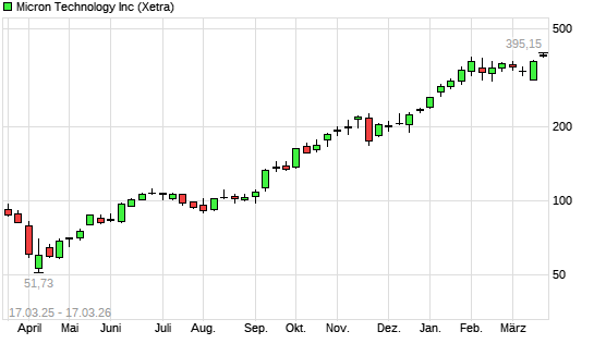 Mit dem Anstieg auf 385,50 EUR hat die Micron Technology-Aktie (ISIN US5951121038) am 16.03.2026 ein neues All-Time-High erreicht und damit den Kurs vom 13.03.2026 eingestellt.