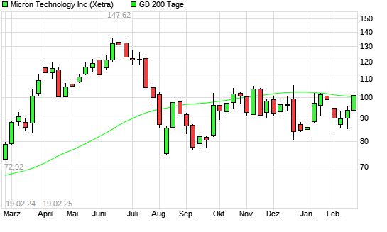 Mit dem Anstieg auf 102,16 EUR hat die Micron Technology-Aktie am 18.02.2025 die 200-Tage-Linie nach oben gekreuzt.
