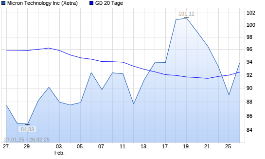 Mit dem Rücksetzer auf 88,40 EUR hat die Micron Technology-Aktie am 25.02.2025 die 20-Tage-Linie nach unten gekreuzt.