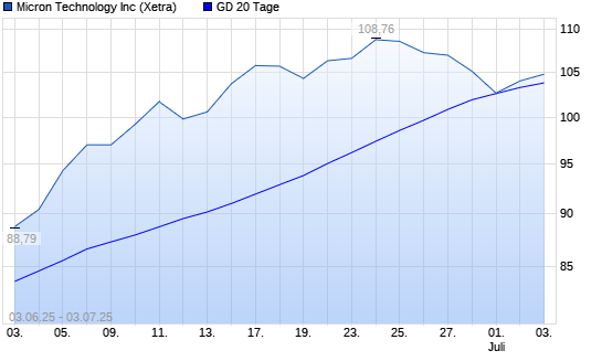 Mit dem Rücksetzer auf 103,00 EUR hat die Micron Technology-Aktie am 02.07.2025 die 20-Tage-Linie nach unten gekreuzt.