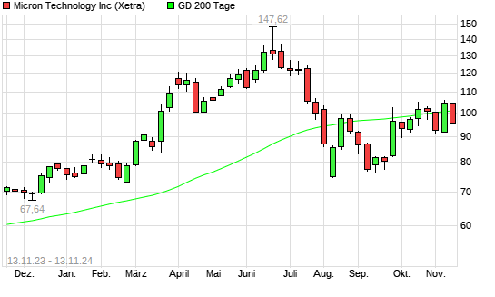 Mit dem Rücksetzer auf 97,28 EUR hat die Micron Technology-Aktie am 12.11.2024 die 200-Tage-Linie nach unten gekreuzt.