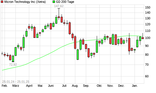 Mit dem Rücksetzer auf 98,06 EUR hat die Micron Technology-Aktie am 24.01.2025 die 200-Tage-Linie nach unten gekreuzt.