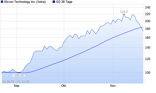Mit dem Rücksetzer auf 175,28 EUR hat die Micron Technology-Aktie am 20.11.2025 die 38-Tage-Linie nach unten gekreuzt.
