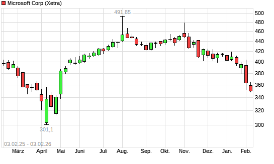 Mit dem Rücksetzer auf 359,30 EUR hat die Microsoft-Aktie (ISIN US5949181045) am 02.02.2026 ein neues 6-Monats-Tief erreicht und damit den Kurs vom 29.01.2026 eingestellt.