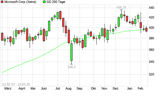 Mit dem Rücksetzer auf 397,40 EUR hat die Microsoft-Aktie am 11.02.2025 die 200-Tage-Linie nach unten gekreuzt.