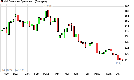 Mit dem Rücksetzer auf 115,40 EUR hat die Mid American Apartment-Aktie (ISIN US59522J1034) am 13.10.2025 ein neues 12-Monats-Tief erreicht und damit den Kurs vom 10.10.2025 eingestellt.