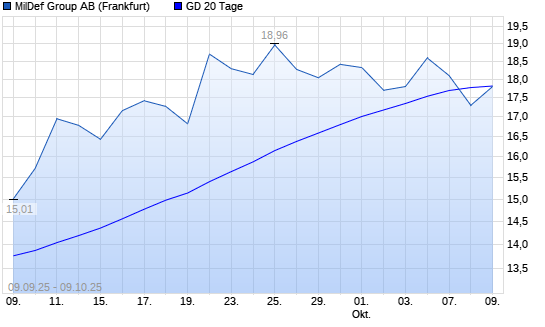 Mit dem Rücksetzer auf 17,30 EUR hat die MilDef Group-Aktie am 08.10.2025 die 20-Tage-Linie nach unten gekreuzt.