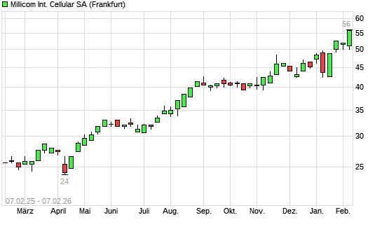 Mit dem Anstieg auf 55,50 EUR hat die Millicom-Aktie (ISIN LU0038705702) am 06.02.2026 ein neues 10-Jahres-Hoch erreicht und damit den Kurs vom 05.02.2026 eingestellt.