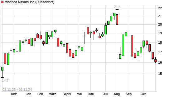 Mit dem Rücksetzer auf 16,10 EUR hat die Minebea Mitsumi-Aktie (ISIN JP3906000009) am 01.11.2024 ein neues 6-Monats-Tief erreicht und damit den Kurs vom 17.09.2024 eingestellt.