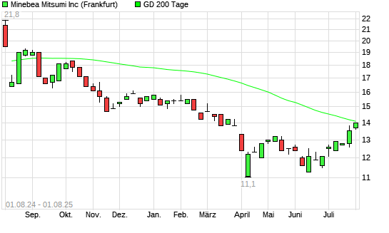 Mit dem Anstieg auf 14,00 EUR hat die Minebea Mitsumi-Aktie am 31.07.2025 die 200-Tage-Linie nach oben gekreuzt.