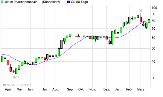 Mit dem Anstieg auf 80,50 EUR hat die Mirum Pharmaceuticals-Aktie am 17.03.2026 die 50-Tage-Linie nach oben gekreuzt.