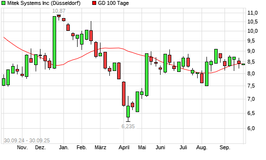 Mit dem Anstieg auf 8,40 EUR hat die Mitek Systems-Aktie am 29.09.2025 die 100-Tage-Linie nach oben gekreuzt.