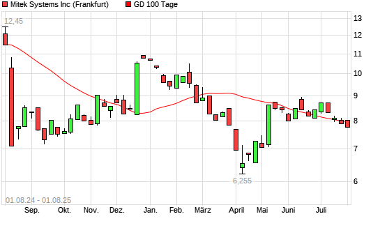 Mit dem Rücksetzer auf 7,92 EUR hat die Mitek Systems-Aktie am 31.07.2025 die 100-Tage-Linie nach unten gekreuzt.