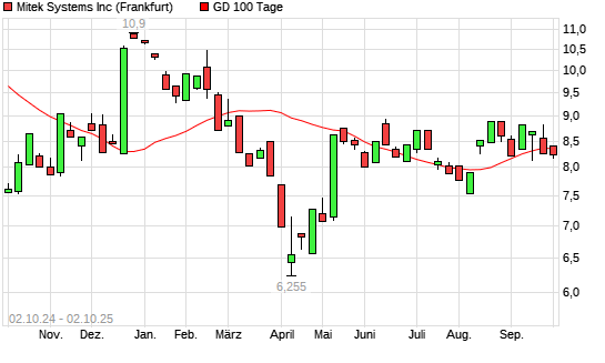 Mit dem Rücksetzer auf 8,17 EUR hat die Mitek Systems-Aktie am 01.10.2025 die 100-Tage-Linie nach unten gekreuzt.
