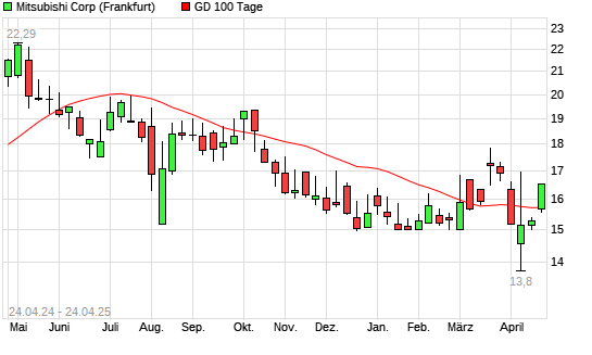 Mit dem Anstieg auf 16,30 EUR hat die Mitsubishi-Aktie am 23.04.2025 die 100-Tage-Linie nach oben gekreuzt.