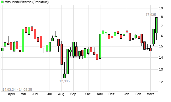 Mit dem Anstieg auf 16,91 EUR hat die Mitsubishi Electric-Aktie (ISIN JP3902400005) am 13.03.2025 ein neues 6-Monats-Hoch erreicht und damit den Kurs vom 07.03.2025 eingestellt.