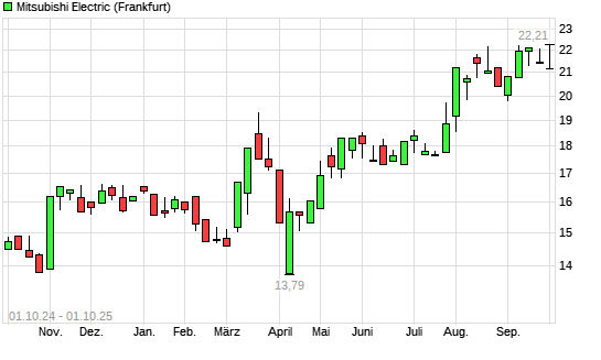 Mit dem Anstieg auf 22,21 EUR hat die Mitsubishi Electric-Aktie (ISIN JP3902400005) am 30.09.2025 ein neues All-Time-High erreicht und damit den Kurs vom 19.08.2025 eingestellt.
