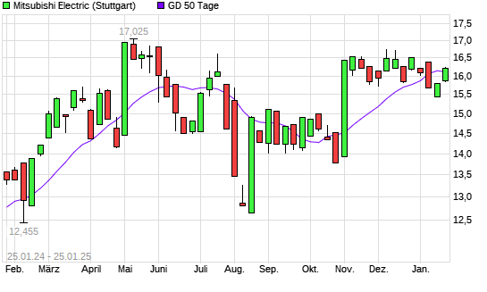 Mit dem Anstieg auf 16,09 EUR hat die Mitsubishi Electric-Aktie am 24.01.2025 die 50-Tage-Linie nach oben gekreuzt.