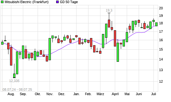 Mit dem Rücksetzer auf 17,67 EUR hat die Mitsubishi Electric-Aktie am 07.07.2025 die 50-Tage-Linie nach unten gekreuzt.
