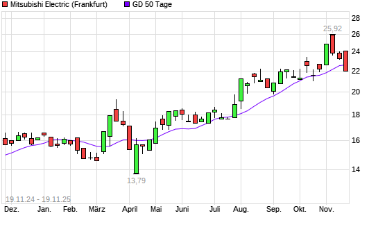 Mit dem Rücksetzer auf 22,32 EUR hat die Mitsubishi Electric-Aktie am 18.11.2025 die 50-Tage-Linie nach unten gekreuzt.