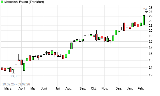 Mit dem Anstieg auf 23,80 EUR hat die Mitsubishi Estate-Aktie (ISIN JP3899600005) am 09.02.2026 ein neues 10-Jahres-Hoch erreicht und damit den Kurs vom 06.02.2026 eingestellt.