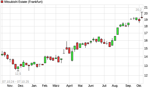 Mit dem Anstieg auf 19,90 EUR hat die Mitsubishi Estate-Aktie (ISIN JP3899600005) am 06.10.2025 ein neues 5-Jahres-Hoch erreicht und damit den Kurs vom 18.09.2025 eingestellt.