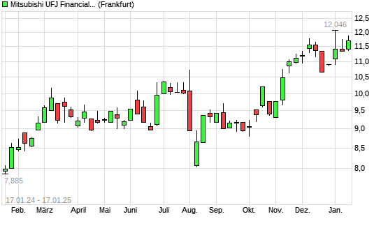 Mit dem Anstieg auf 11,80 EUR hat die Mitsubishi Financial-Aktie (ISIN JP3902900004) am 16.01.2025 ein neues 10-Jahres-Hoch erreicht und damit den Kurs vom 15.01.2025 eingestellt.