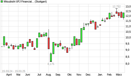 Mit dem Anstieg auf 12,63 EUR hat die Mitsubishi Financial-Aktie (ISIN JP3902900004) am 14.03.2025 ein neues 10-Jahres-Hoch erreicht und damit den Kurs vom 19.02.2025 eingestellt.
