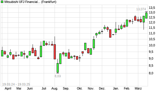 Mit dem Anstieg auf 12,90 EUR hat die Mitsubishi Financial-Aktie (ISIN JP3902900004) am 18.03.2025 ein neues 10-Jahres-Hoch erreicht und damit den Kurs vom 14.03.2025 eingestellt.