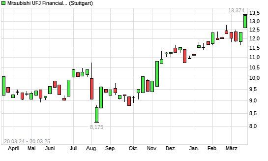 Mit dem Anstieg auf 12,97 EUR hat die Mitsubishi Financial-Aktie (ISIN JP3902900004) am 19.03.2025 ein neues 10-Jahres-Hoch erreicht und damit den Kurs vom 18.03.2025 eingestellt.
