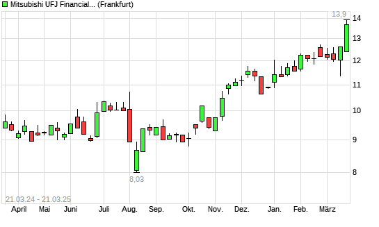 Mit dem Anstieg auf 13,20 EUR hat die Mitsubishi Financial-Aktie (ISIN JP3902900004) am 20.03.2025 ein neues 10-Jahres-Hoch erreicht und damit den Kurs vom 19.03.2025 eingestellt.