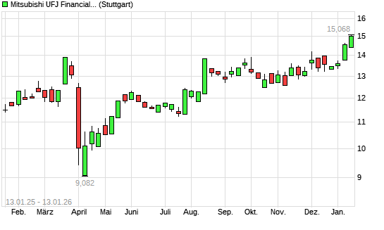 Mit dem Anstieg auf 14,66 EUR hat die Mitsubishi Financial-Aktie (ISIN JP3902900004) am 12.01.2026 ein neues All-Time-High erreicht und damit den Kurs vom 09.01.2026 eingestellt.