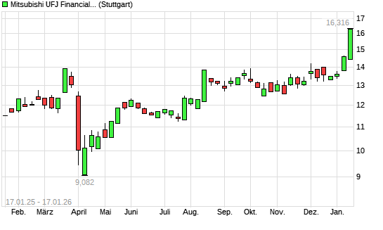 Mit dem Anstieg auf 16,25 EUR hat die Mitsubishi Financial-Aktie (ISIN JP3902900004) am 16.01.2026 ein neues All-Time-High erreicht und damit den Kurs vom 15.01.2026 eingestellt.
