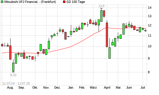 Mit dem Rücksetzer auf 11,42 EUR hat die Mitsubishi Financial-Aktie am 10.07.2025 die 100-Tage-Linie nach unten gekreuzt.