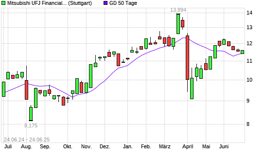 Mit dem Rücksetzer auf 11,32 EUR hat die Mitsubishi Financial-Aktie am 23.06.2025 die 50-Tage-Linie nach unten gekreuzt.