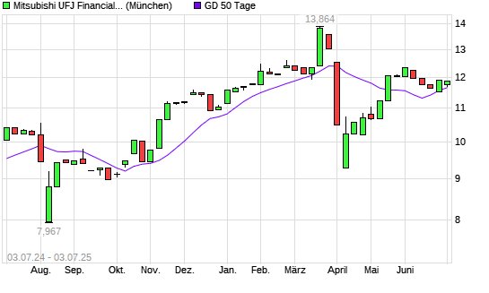 Mit dem Rücksetzer auf 11,49 EUR hat die Mitsubishi Financial-Aktie am 02.07.2025 die 50-Tage-Linie nach unten gekreuzt.