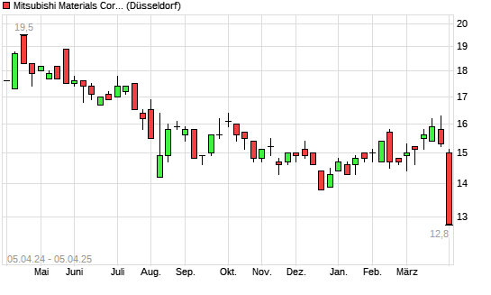 Mit dem Rücksetzer auf 13,50 EUR hat die Mitsubishi Materials-Aktie (ISIN JP3903000002) am 04.04.2025 ein neues 12-Monats-Tief erreicht und damit den Kurs vom 20.12.2024 eingestellt.