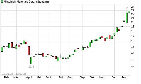 Mit dem Anstieg auf 22,40 EUR hat die Mitsubishi Materials-Aktie (ISIN JP3903000002) am 12.01.2026 ein neues 5-Jahres-Hoch erreicht und damit den Kurs vom 08.01.2026 eingestellt.