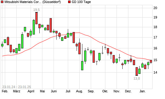 Mit dem Rücksetzer auf 15,00 EUR hat die Mitsubishi Materials-Aktie am 22.01.2025 die 100-Tage-Linie nach unten gekreuzt.